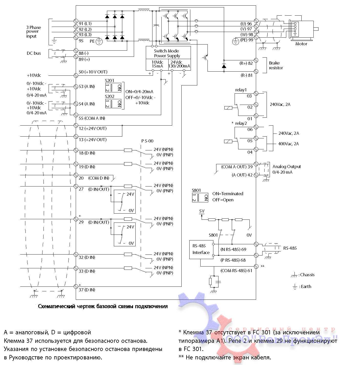 | Схематический черчеж базовой схемы подключения частотного преобразователя DANFOSS FC300 | |