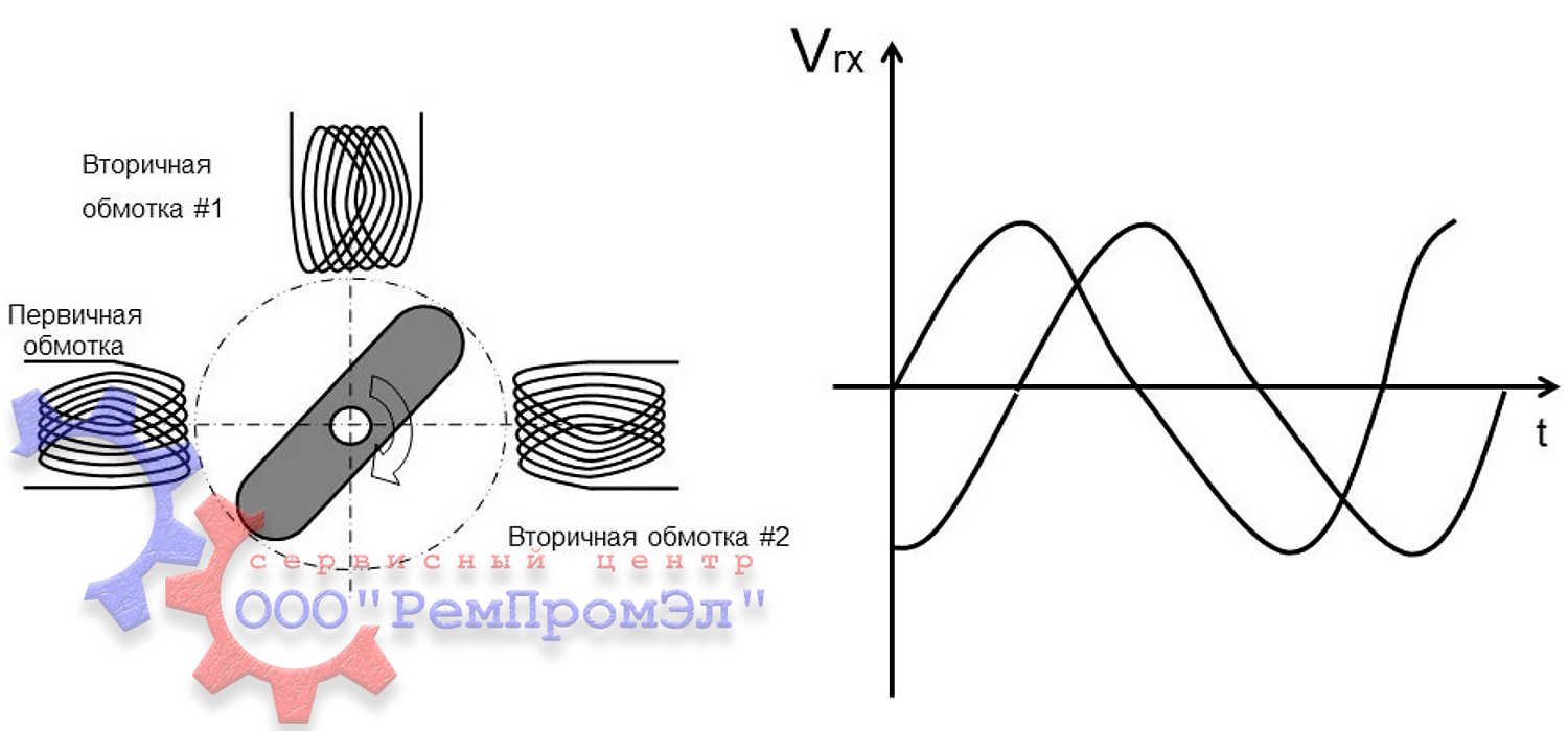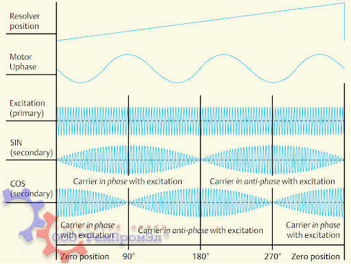 На приведенном ниже рисунке выходной сигнал вторичных обмоток представлен в виде графика синус и косинус. Соответственно, отношение сигналов изменяется пропорционально углу.